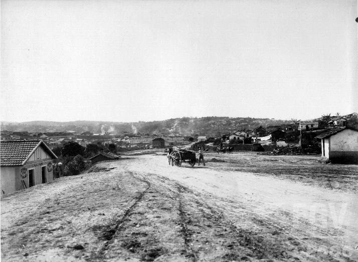 Abertura da Rua Uberaba, se destacando na paisagem os testemunhos da terraplanagem em andamento, o prédio do Casa de Correção e as cafuas da Favela da Barroca.